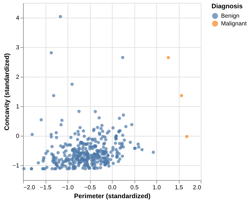 Breast tumors can be diagnosed by performing a biopsy, a process where tissue is removed from the body and examined for the presence of disease. Traditionally these procedures were quite invasive; modern methods such as fine needle aspiration, used to collect the present data set, extract only a small amount of tissue and are less invasive. Based on a digital image of each breast tissue sample collected for this data set, ten different variables were measured for each cell nucleus in the image (items 3–12 of the list of variables below), and then the mean for each variable across the nuclei was recorded. As part of the data preparation, these values have been standardized (centered and scaled); we will discuss what this means and why we do it later in this chapter. Each image additionally was given a unique ID and a diagnosis by a physician. Therefore, the total set of variables per image in this data set is: