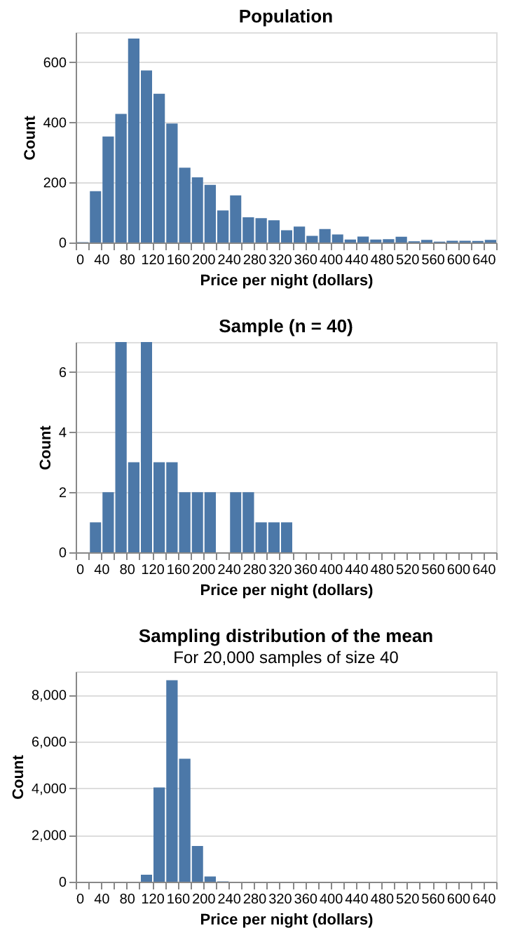 To finish our estimation of the population parameter, we would report the point estimate and our confidence interval’s lower and upper bounds. Here the sample mean price-per-night of 40 Airbnb listings was $153.48, and we are 95% “confident” that the true population mean price-per-night for all Airbnb listings in Vancouver is between $121.61 and $191.53. Notice that our interval does indeed contain the true population mean value, $154.51! However, in practice, we would not know whether our interval captured the population parameter or not because we usually only have a single sample, not the entire population. This is the best we can do when we only have one sample!