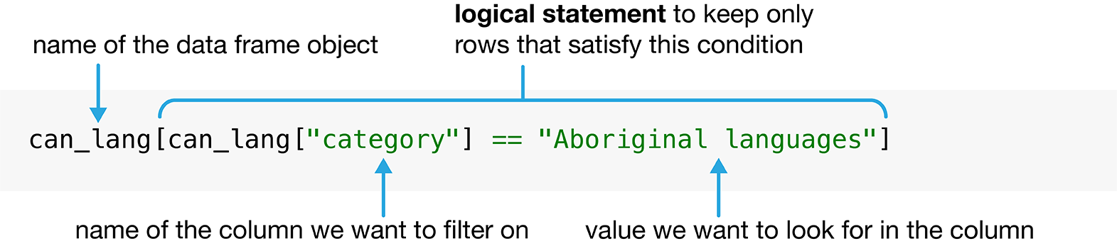 This code is the same as the code we showed earlier; you can see the same sequence of methods and arguments is used. But long expressions are split across multiple lines when they would otherwise get long and unwieldy, improving the readability of the code. How does Python know when to keep reading on the next line for a single expression? For the line starting with aboriginal_lang = ..., Python sees that the line ends with a left bracket symbol [, and knows that our expression cannot end until we close it with an appropriate corresponding right bracket symbol ]. We put the same two arguments as we did before, and then the corresponding right bracket appears after ["language", "mother_tongue"]). For the line starting with arranged_lang_sorted = ..., Python sees that the line ends with a left parenthesis symbol (, and knows the expression cannot end until we close it with the corresponding right parenthesis symbol ). Again we use the same two arguments as before, and then the corresponding right parenthesis appears right after ascending=False. In both cases, Python keeps reading the next line to figure out what the rest of the expression is. We could, of course, put all of the code on one line of code, but splitting it across multiple lines helps a lot with code readability.