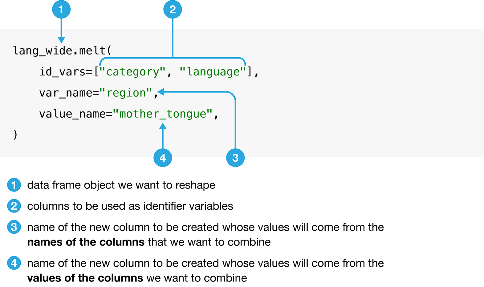 meltandpivot, but also covers missing values and additional wrangling functions (likestack). The data aggregation chapter coversgroupby, aggregating functions,apply, etc.You will occasionally encounter a case where you need to iterate over items in a data frame, but none of the above functions are flexible enough to do what you want. In that case, you may consider using a for loop [McKinney, 2012].